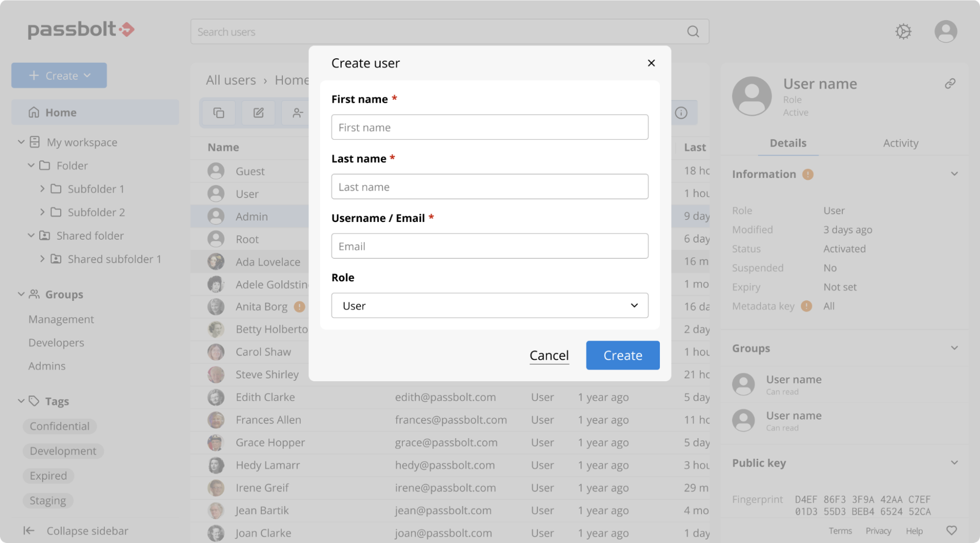 Passbolt allows administrators to control user actions by limiting access to specific capabilities through its RBAC model, particularly via the default User role. With version 5.8, this access model is extended beyond the default Admin and User roles, enabling administrators to create additional roles and assign them to users.