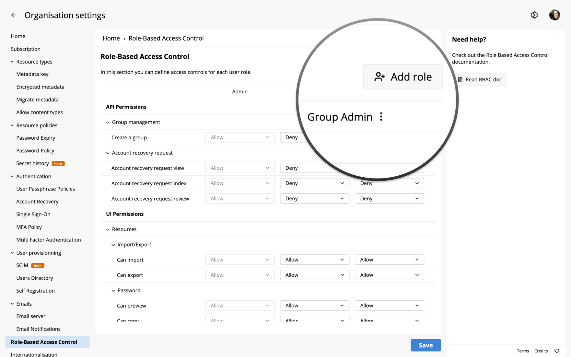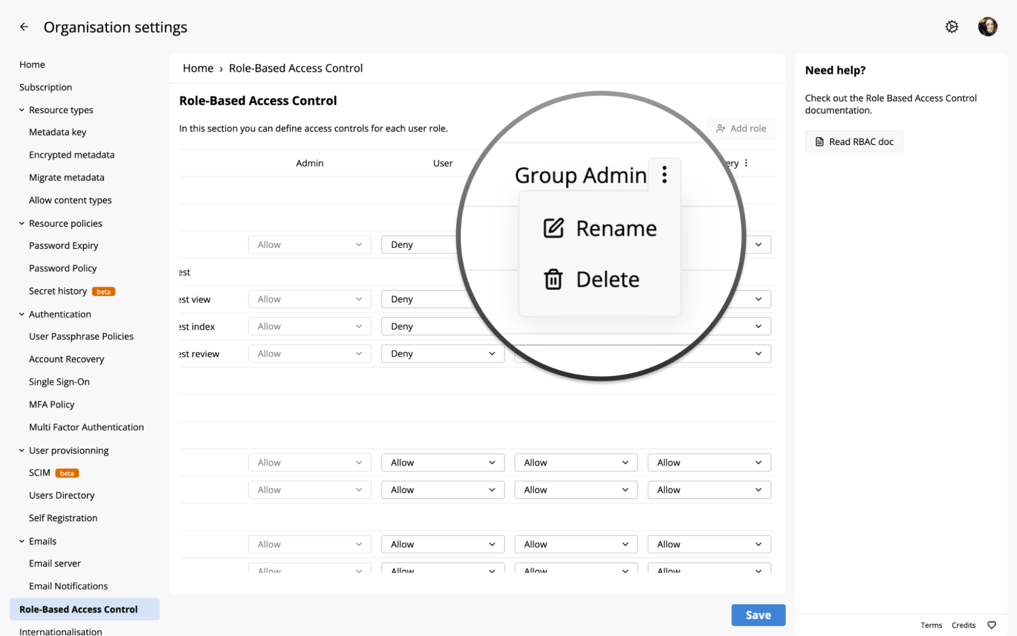 Dynamic role management applies RBAC rules at the API and action level, ensuring permissions are enforced consistently across both UI and API interactions. This provides a solid foundation that can be expanded as additional needs and use cases are identified.