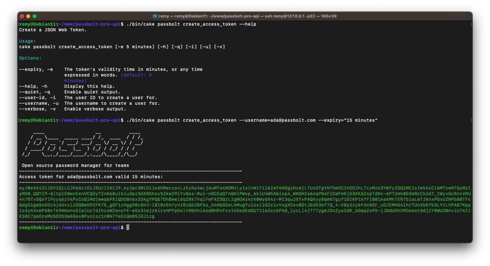 ./bin/cake passbolt create_access_token --username=<youremail> --expiry="15 minutes"You can then use the above command to generate a temporary API key to be used for authentication. This key will be used in Postman to authorize your requests.