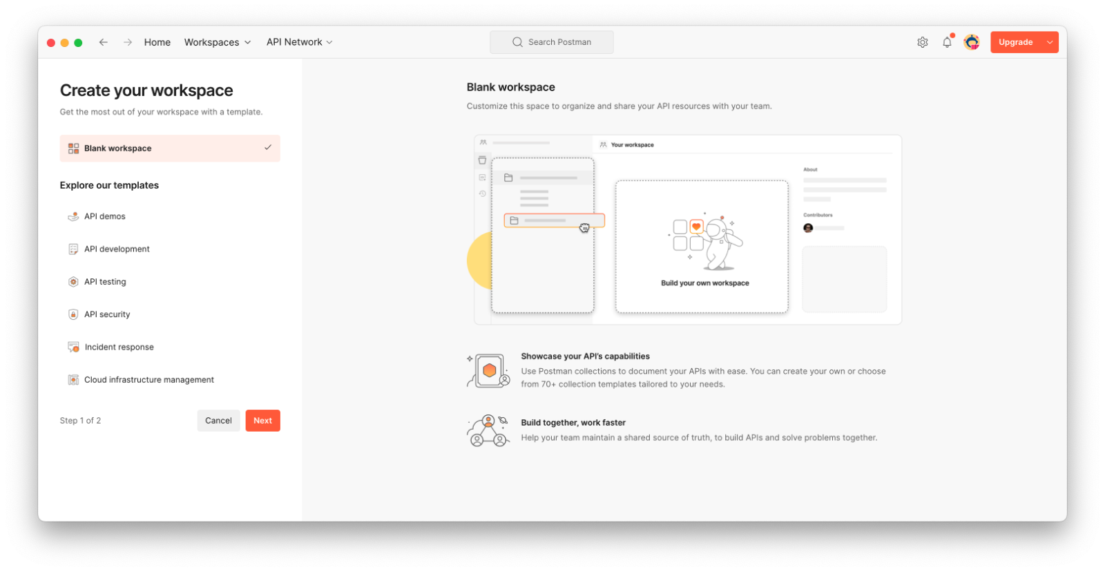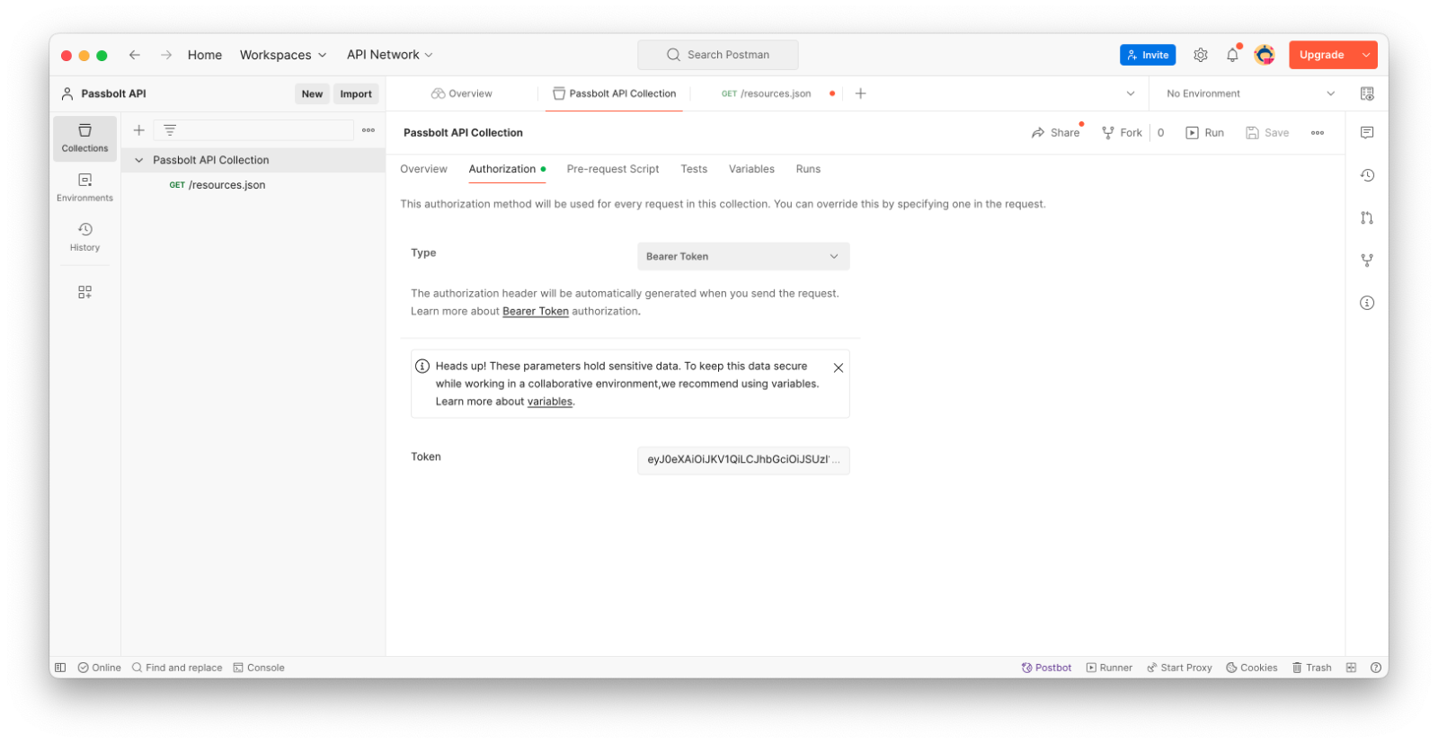 You can then start by creating a new blank personal workspace and a new collection. The collections will allow to group the requests, like a folder for files. Select that new collection “Authorization” tab, and set the authorization method to “Type: Bearer Token” and place the previously generated JWT in the “Token” field. This will allow you to avoid having to share a common authentication method for every request under the collection, and easily replace the token once it expires.