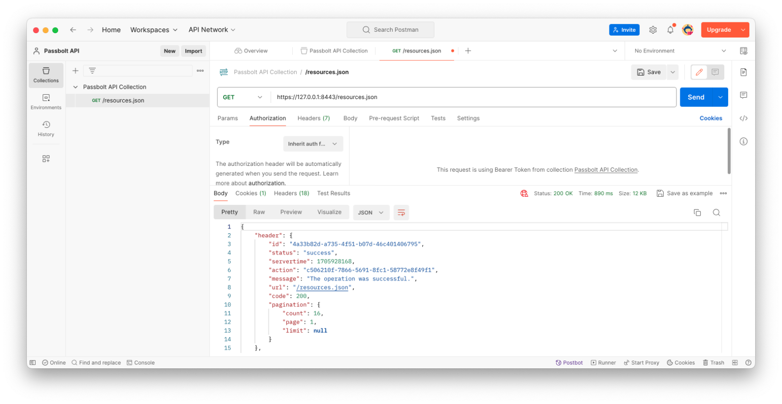 It is now time to create our first request. With this one we will list all of the resources present in passbolt for the user. You can let the default request type (GET) and enter the Passbolt API url `https://[yourdomain]/resources.json` . Then under authorization, make sure “Inherit auth from parent” is selected. Then you can click send and voila! Under the body you can see the response from the API.
