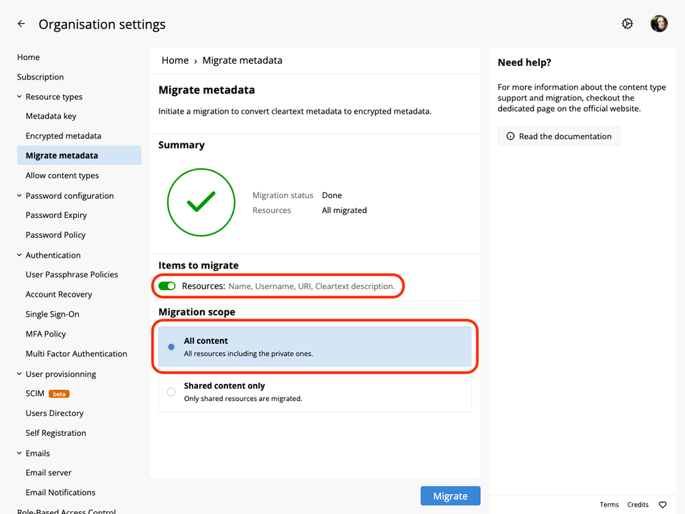 Enabling encrypted resource metadata affects only new items. To migrate earlier content, a Migrate metadata setting page is available for administrators in the organisation settings.