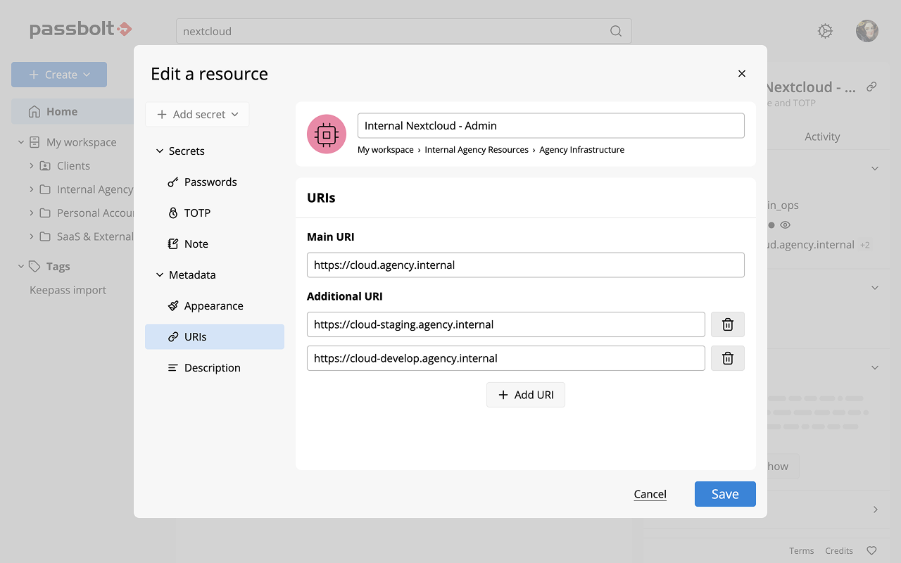 Encrypted resource metadata lets you attach several URIs to the same resource (see Fig. “Multiple URIs” in the edit dialog). Autofill now recognises any listed URI, saving you the manual search and paste routine and reducing the chance of entering credentials on the wrong page.