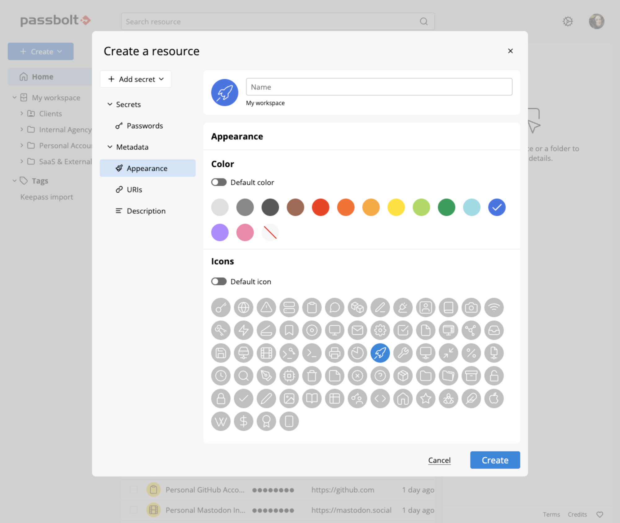 Scrolling through long lists of text-only credentials can quickly become overwhelming. Encrypted resource metadata solves this by letting you add simple visual cues, icons and colours, to each resource. The initial collection of icons is borrowed directly from the KeePass set, ensuring that imports and exports maintain their familiar appearance.