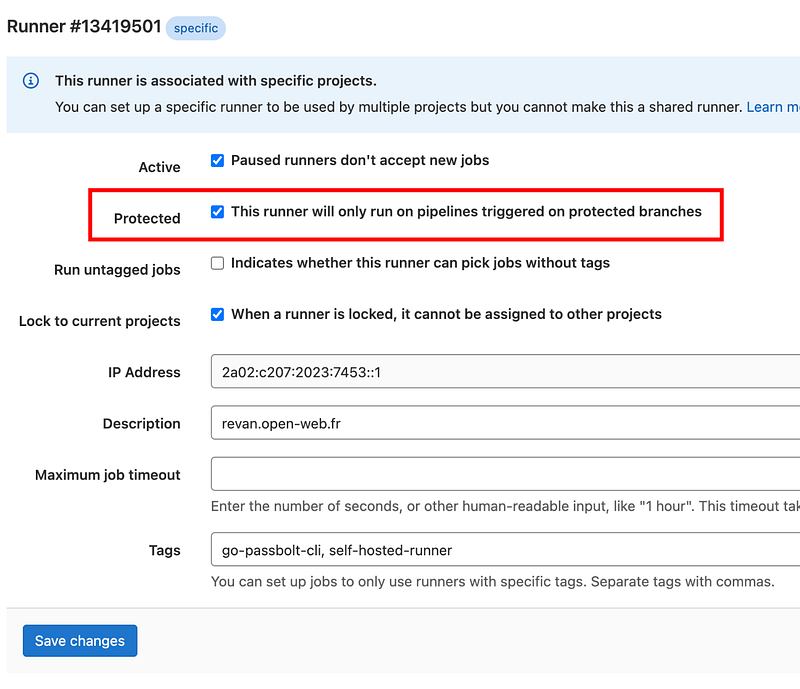 There is still one issue to solve. Indeed with the default rights, anyone having access to the repository would be able to modify the gitlab jobs and modify the script run on the runner to extract some valuable data such as the private key. In order to protect your pipeline and avoid it to be launched or modified by an unwanted person, we need to do some additional hardening on the configuration.