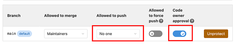 - if: $CI_COMMIT_REF_NAME == "main"Protect the main branch by set the “Allowed to push” to “No one” and enable the Code Owner approval feature.