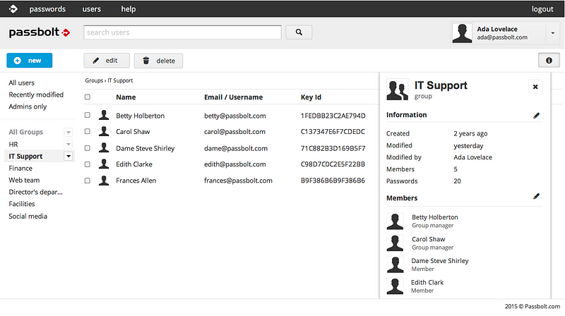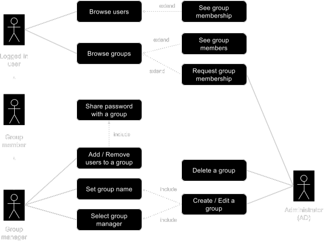 Administrators will be responsible of creating/deleting groups and assigning one or more group managers per group. Group managers will be responsible for adding/removing users to/from the group and sharing group passwords with new users. All users will be able to share passwords directly with a group, rather than with each user individually.