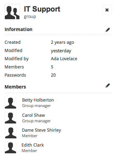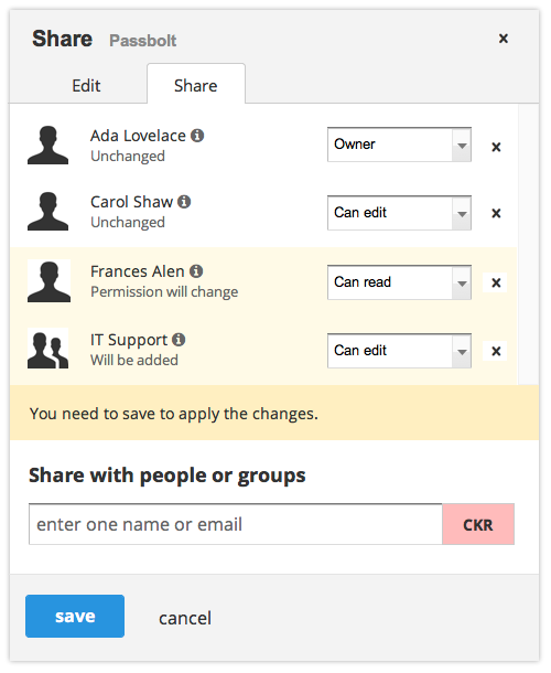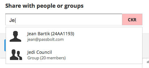When sharing a password it is now possible to enter the name of a group and to define the level of privilege. The line below the user / group name will now show the latest operation done during the edit, a small but helpful improvement. The email, key fingerprint or group information will still be available by hovering over the “i” icon.