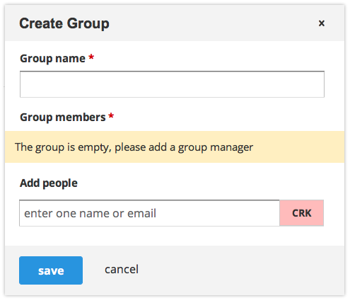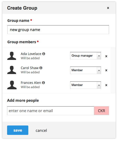When creating a group, the group dialog is shown to the user. They can enter the group name and add group members before saving.