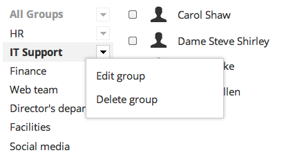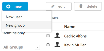 In the left sidebar the user can see a new section where all the groups are listed. The groups a user has the privileges to manage are marked with a dropdown button. This toggle triggers a contextual menu that allows interaction with the group.