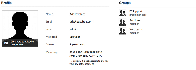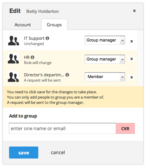A notable change in this dialog is the appearance of a groups tab. This allows the management of the groups a user belongs to. Admin users cannot add people to a group. Instead, they send an email request asking the group manager to add the user. This constraint is due to the security model of passbolt, you can learn more about it in the “approach rationale” section of the specifications.
