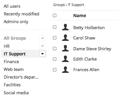 We can now filter the users that belong to a certain group with the click of a button. When selecting a group the edit or/and delete button becomes active depending on the role. The breadcrumb also changes, and a sidebar containing group information is displayed.