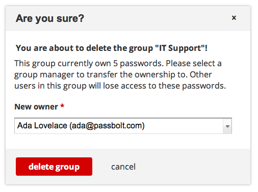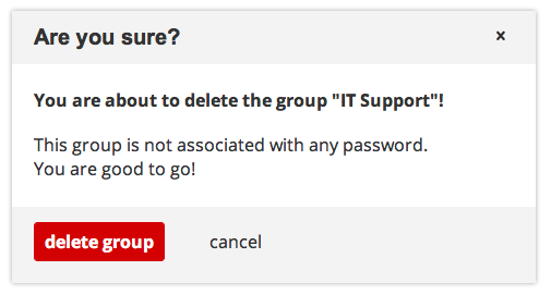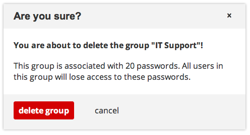 To prevent an administrator from removing a group by accident we show a confirmation dialog. Three cases are possible: if the group is the owner of some passwords we need to transfer the ownership to one group administrator. If the group does not have any passwords associated we display a different message than the case where some user will actually lose access.