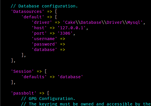 We can now tell Passbolt to use this newly‑created table, by adding the following snippet to the /etc/passbolt/passbolt.php file: