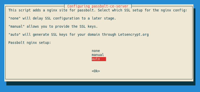 $ sudo dpkg-reconfigure passbolt-ceChoose No to mysql setup — since we have already done that. Then, choose auto when prompted on the following screen: