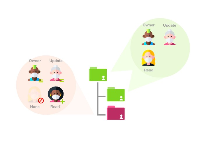 As we can see in the diagram above, exceptions can be created, i.e. it is possible for a user to have more access rights on a child item than they have on its parent folder. The opposite is also possible by restricting access rights, the same way it is possible to create a hidden or restricted file in a shared folder in a traditional filesystem.