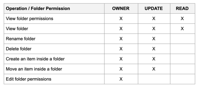 Like resources, a folder must have an owner permission defined in the folder permissions. Two other permissions types are available: update and read. Each permission type give access to operations as described in the grid below: