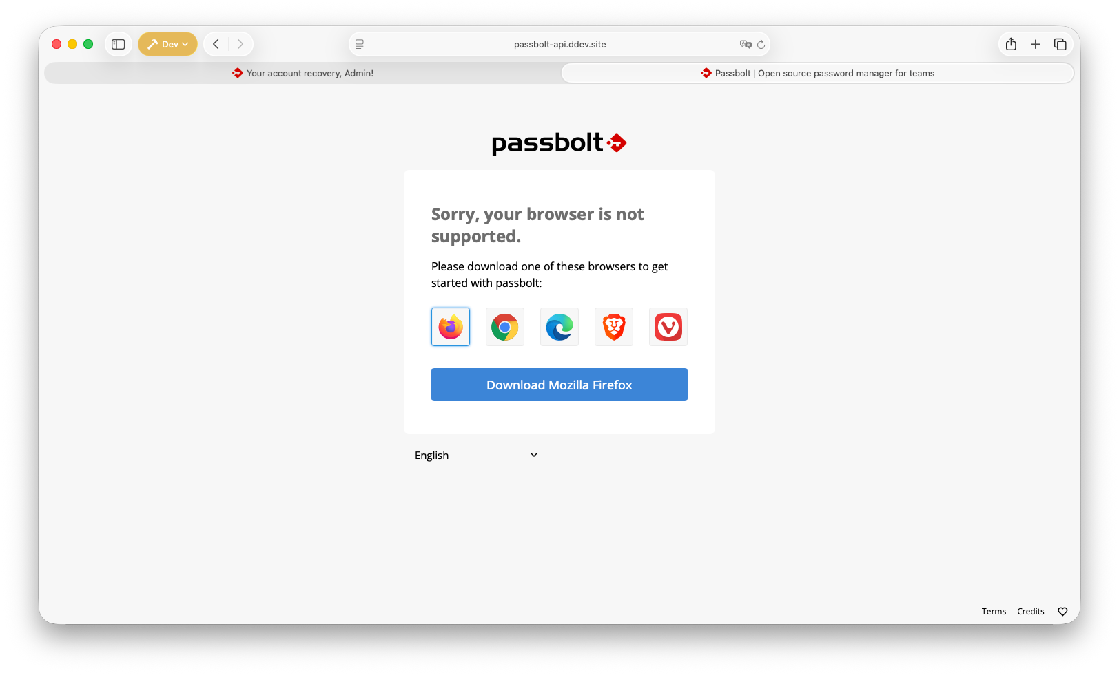 • Recovering an existing account: Open Safari, navigate to your Passbolt instance URL, and enter your email address. You will receive an email with a setup link.