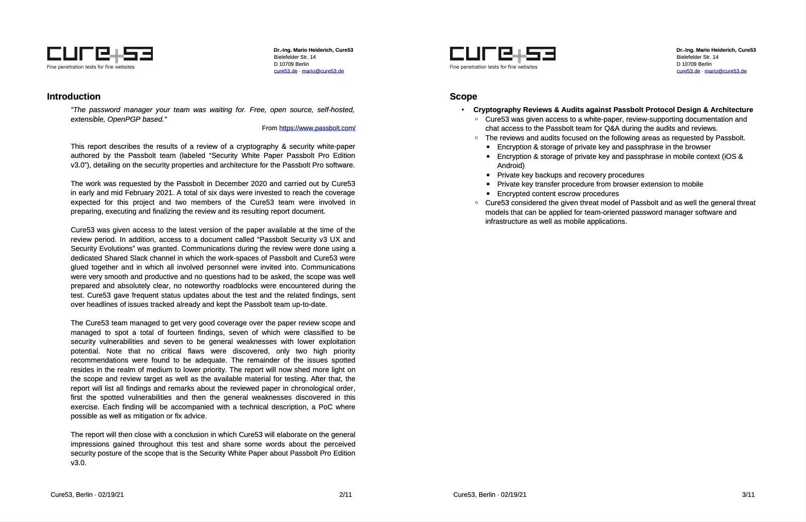 The cryptography of the project was examined by two members of Cure53 over the course of six days, with the results amounting to seven findings of varying severity and seven informational findings.