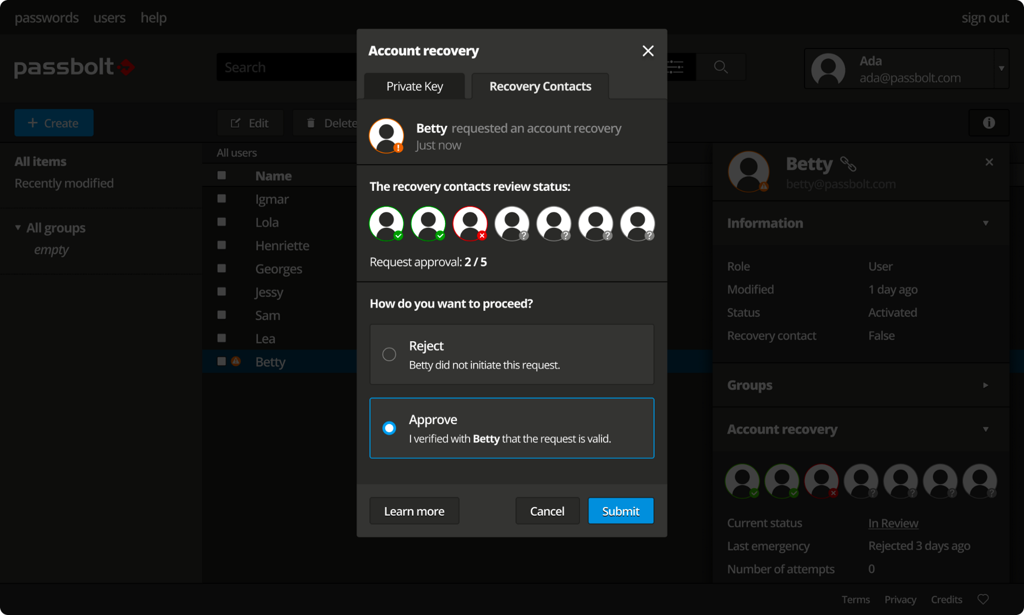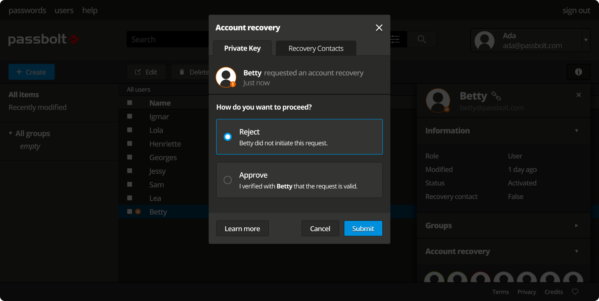 When Ada clicks on the “Review the recovery request” she is redirected to a validation dialog in her passbolt account. In the recovery contact tab, Ada can choose to approve or reject the request.