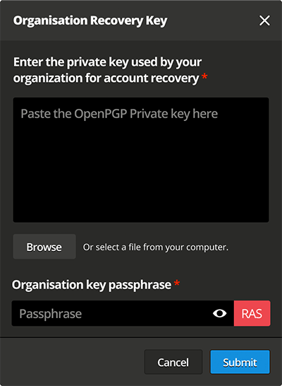 When Ada clicks on the “Review the recovery request”, she is redirected to a validation dialog inside her passbolt account. Ada can choose to approve or reject the request using the Organization Recovery Key, in the “Private Key” tab: