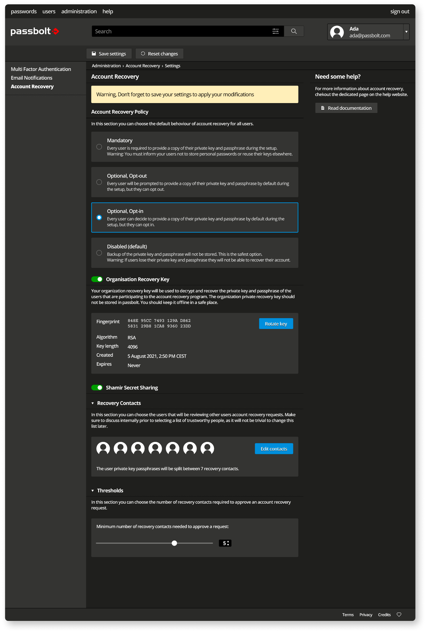 In the Administration workspace, a new section named “Account Recovery” contains all the settings required for enabling this feature.