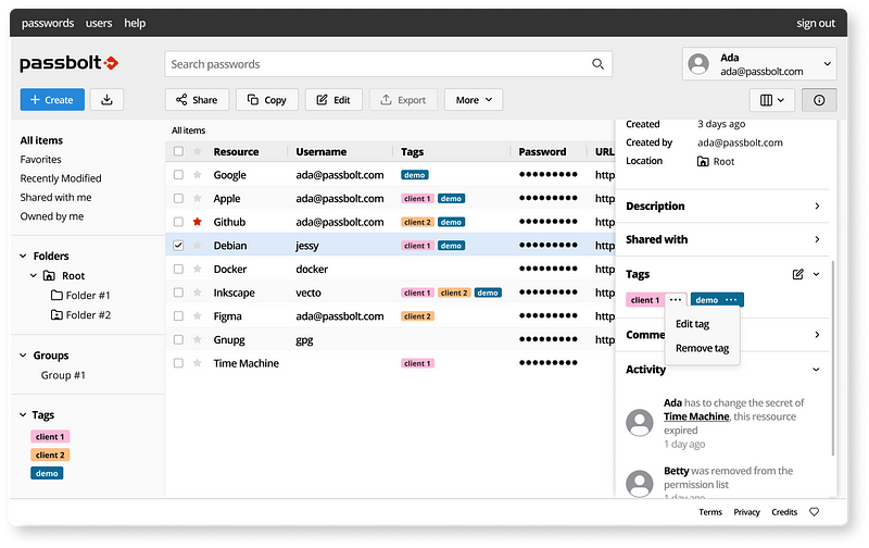 Also, because it’s a Christmas menu, you’ll be glad to know that this first course is offered by the house. The Tags feature will soon be available in passbolt CE. 🎅