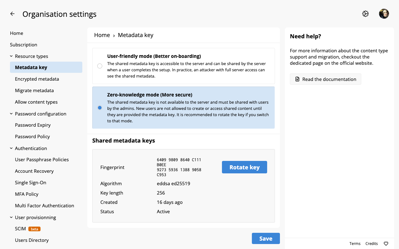 Administrators can now rotate the shared metadata key directly from the organisation settings without disrupting the availability of the instance. This capability gives organisations greater control over their encrypted metadata and is another milestone in completing the encrypted metadata roadmap.