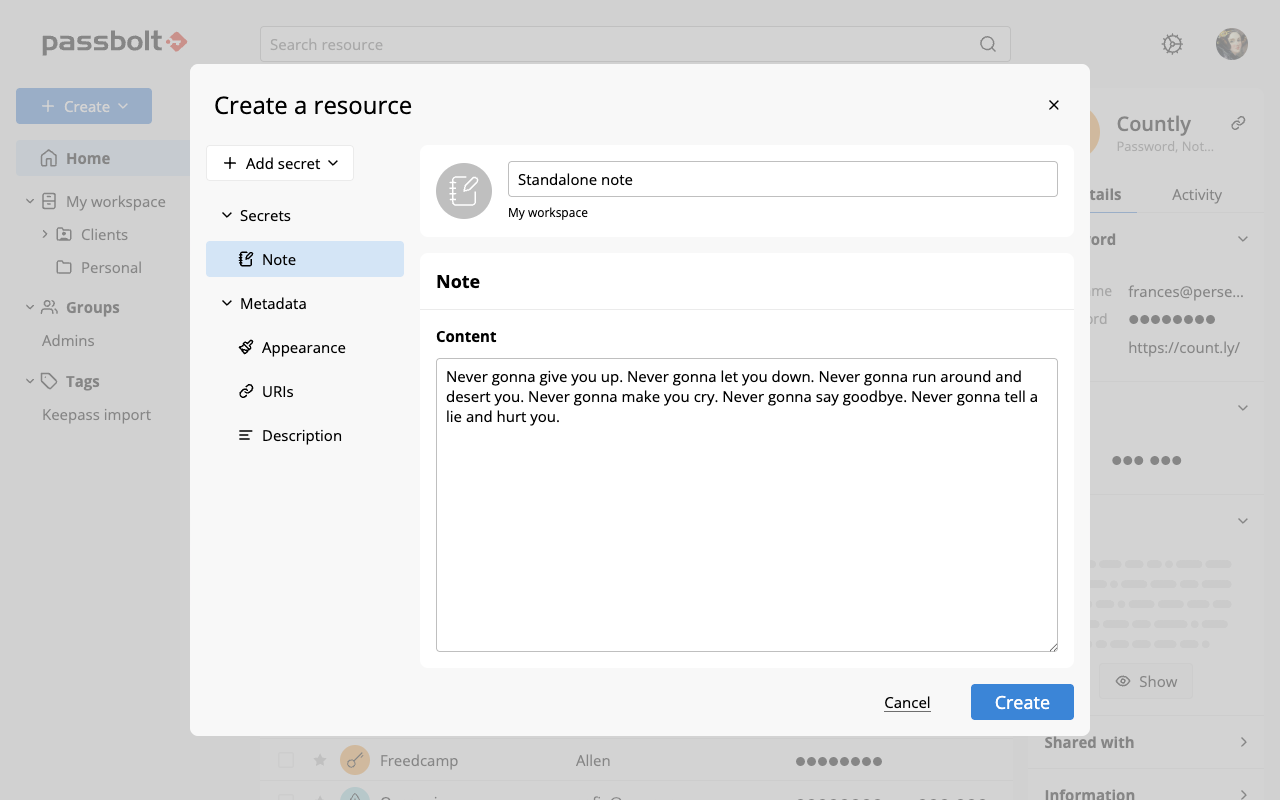 Standalone notes benefit from the same permissions, encryption, and audit trail as passwords, ensuring they remain just as secure and shareable. Each note supports up to 50 KB of text, leaving ample room for certificates, SSH keys, or other long-form secrets that Passbolt plans to support natively in the future. Import and export flows have been updated accordingly and any imported resources that contain only a description will now be recognised and created as standalone notes.