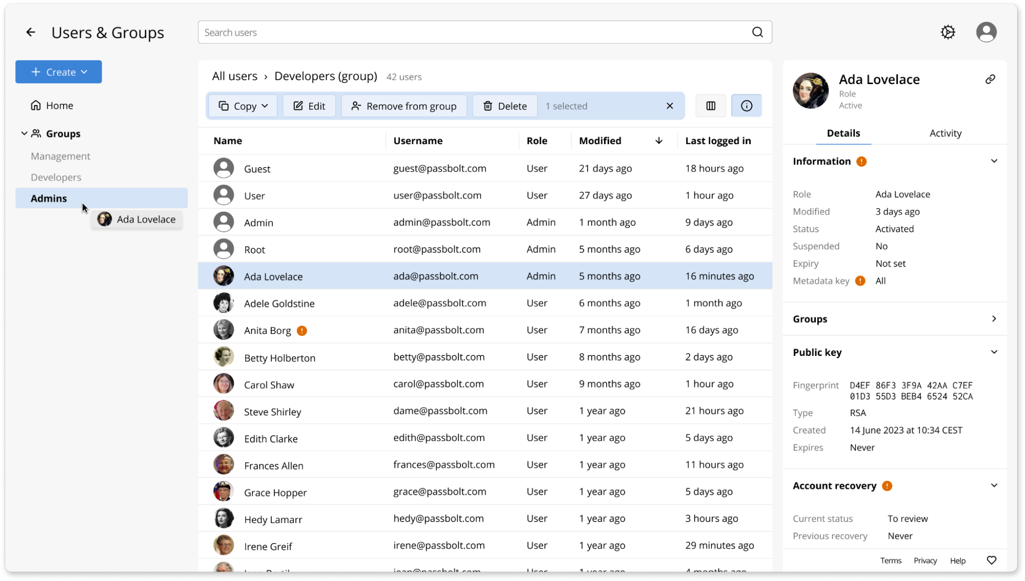 • PB-46646 Reduce accidental destructive actions by moving Delete user and Disable MFA into a More menu in Users and groups