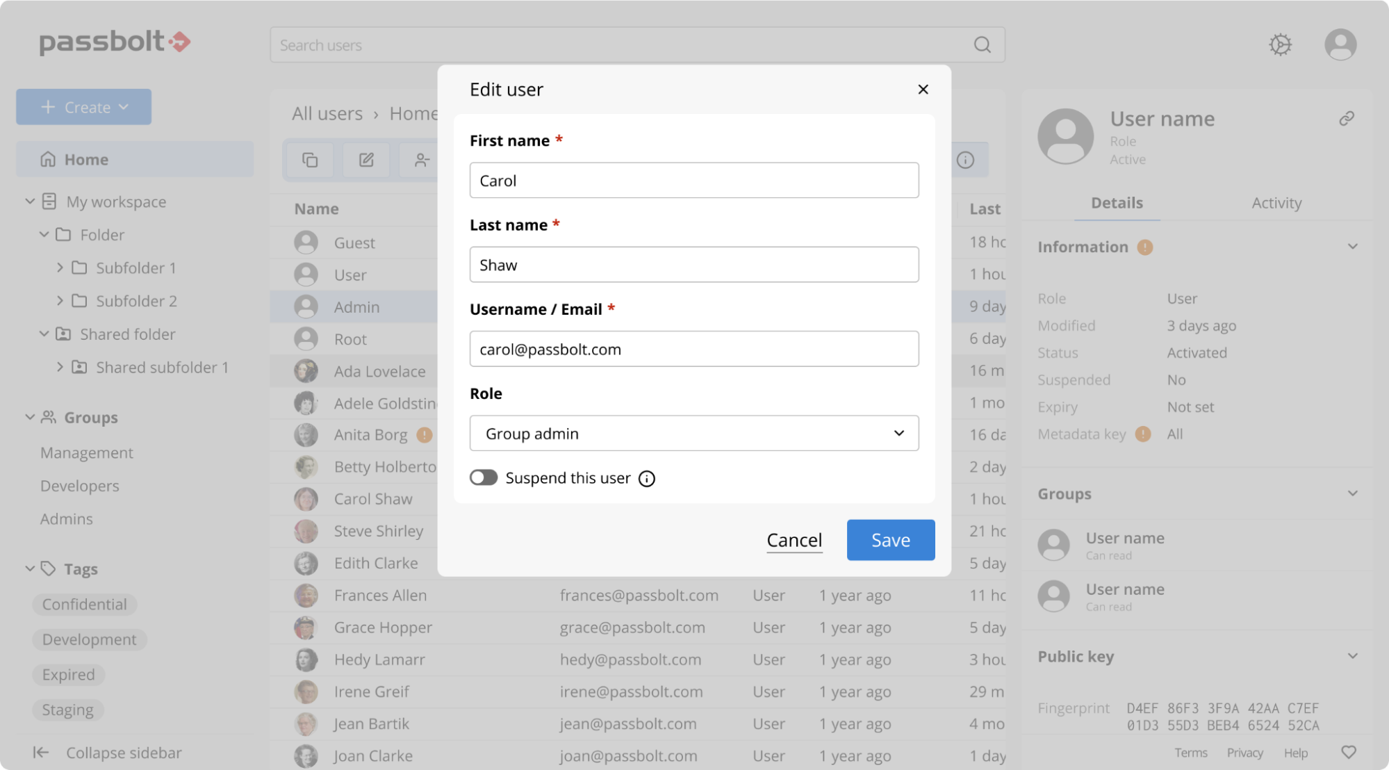 • PB-47345 As an administrator I receive an email notification when a role is created or updated