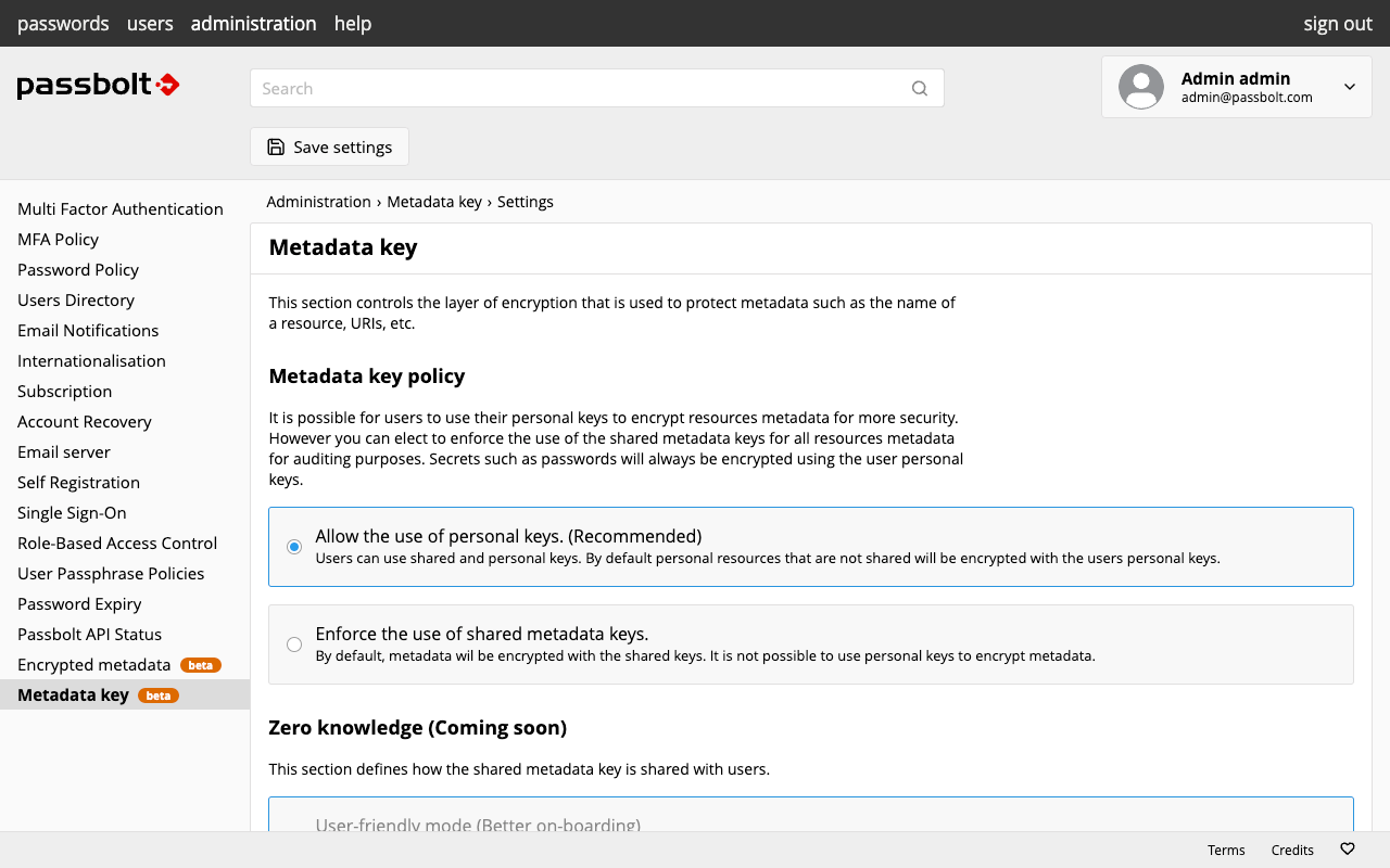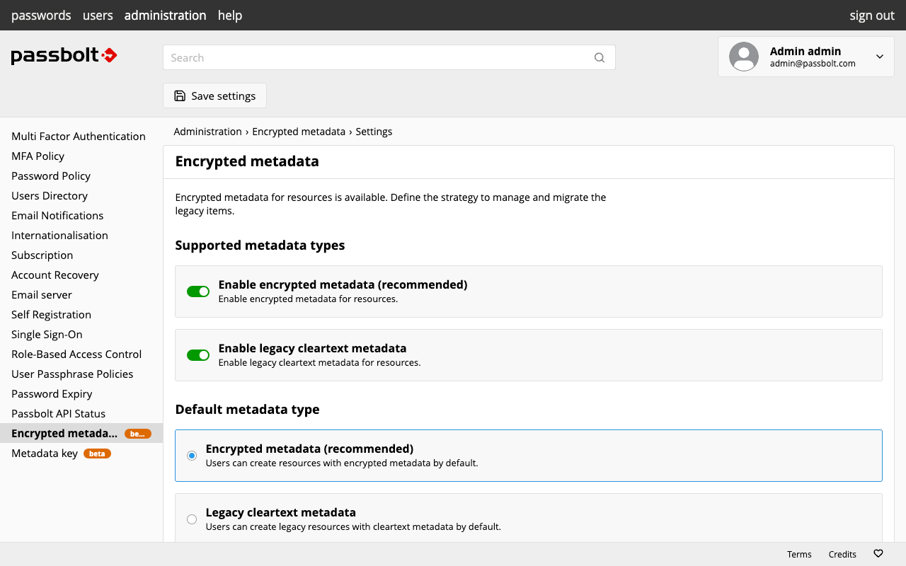 Passbolt v4.11.0 introduces beta support for encrypted metadata in the administration settings, laying groundwork for the upcoming v5 release and its new resource format.