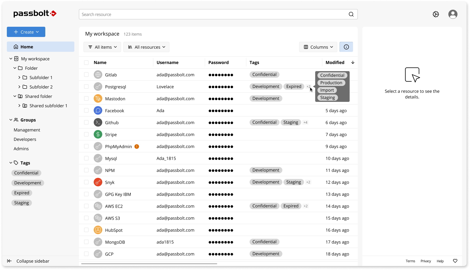 Tags visible in the grid (Passbolt Pro)
