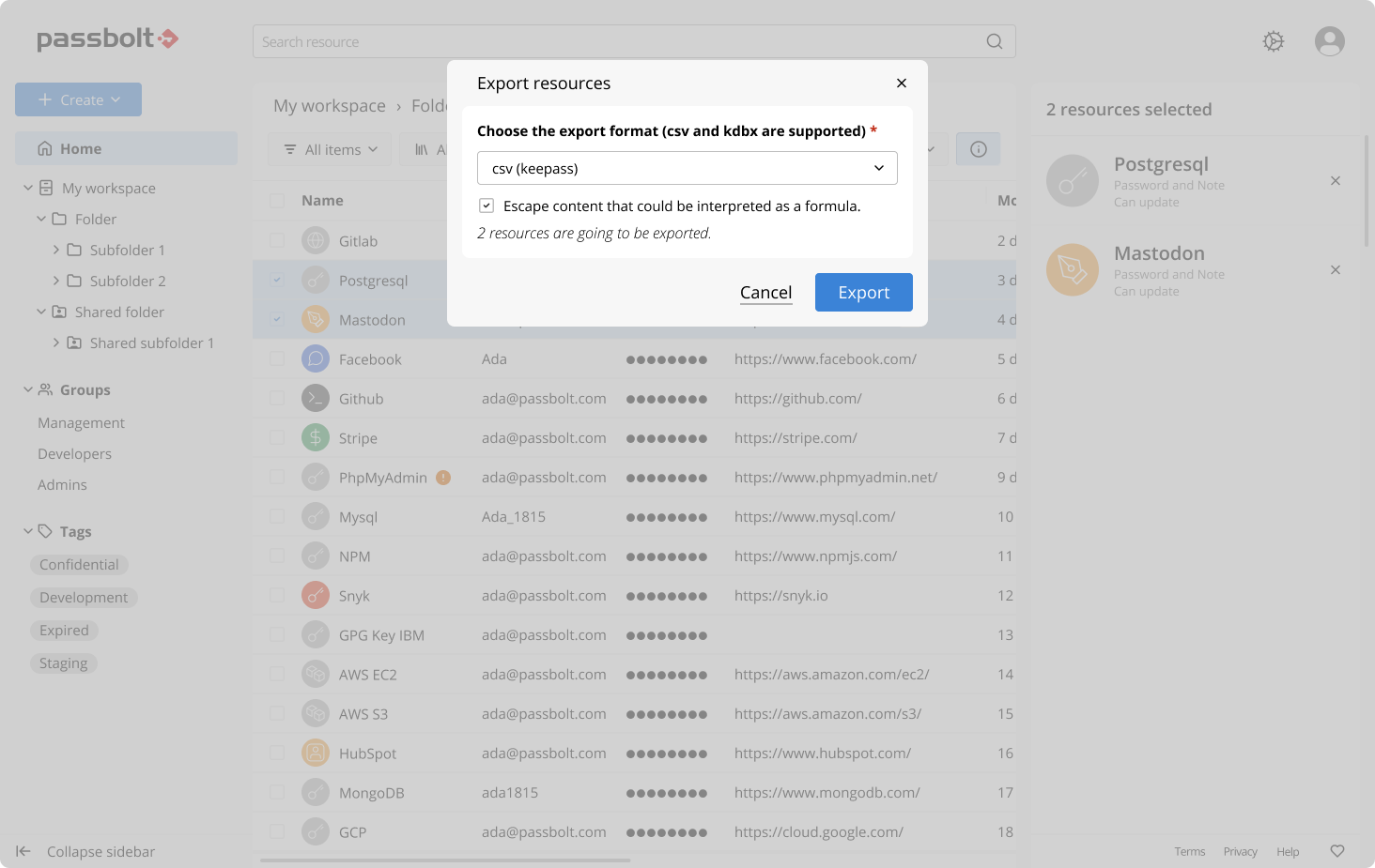 When exporting credentials to CSV, malicious users can inject formula-based payloads in the name field (e.g., =HYPERLINK(...)). If opened in spreadsheet software like Excel or Google Sheets, these fields can leak plaintext passwords via crafted URLs, potentially exposing sensitive data.