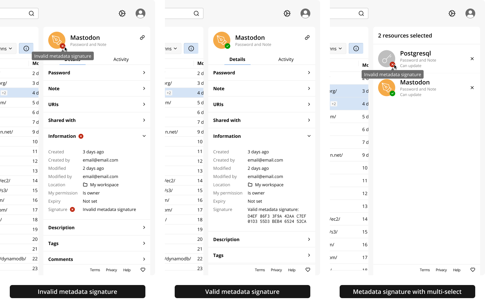 Future versions of the product will address this gap by introducing on-demand signature validation. Instead of verifying every resource's metadata signatures upfront, which would be computationally intensive, Passbolt will validate signatures asynchronously, for example when users interact with individual resources (as in click or select for example). This approach will ensure data integrity while maintaining performance and responsiveness. A new icon in the sidebar UI will expose signature verification details when one or more resources are selected, giving users confidence in the authenticity of what they see before taking further action.